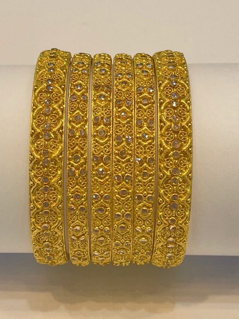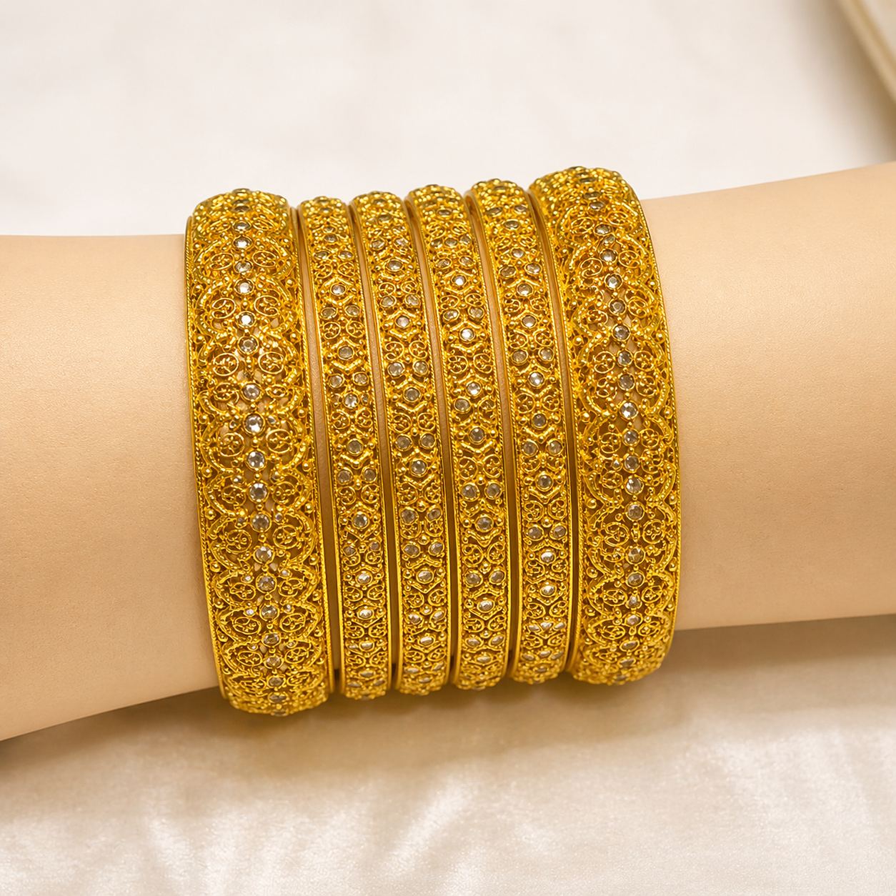 Perfectly styled for weddings, festive occasions, and grand celebrations, these bangles reflect timeless artistry and luxurious appeal. The detailed patterns and polished gold finish ensure that this set stands out as a statement piece while still being versatile enough to complement both traditional and modern outfits.